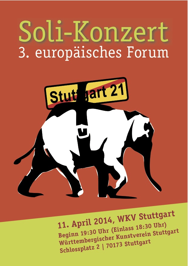 Concertino Stuttgart spielt für das dritte Forum gegen unnütze und aufgezwungene Großprojekte: Freitag, den 11. April 2014 um 19.30 Uhr, Einlass ab 18.30 Uhr, im Württ. Kunstverein, Schlossplatz 2 in Stuttgart